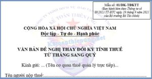 Mẫu 01/DK-TĐKTT Văn bản đề nghị thay đổi kỳ tính thuế từ tháng sang quý; ...
